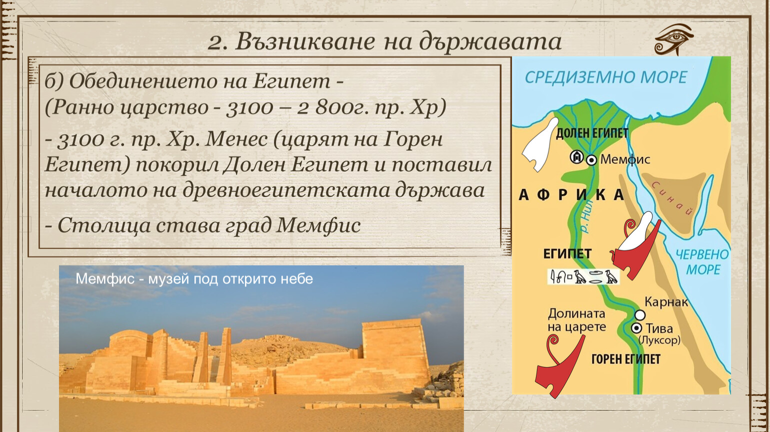 б) Обединението на Египет - (Ранно царство - 3100 – 2 800г. пр. Хр)