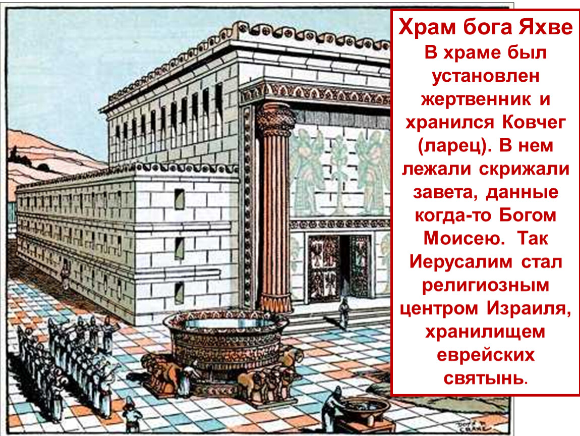 В храме был установлен жертвенник и хранился Ковчег (ларец). В нем лежали скрижали завета, данные когда-то Богом Моисею. Так Иерусалим стал религиозным центром Израиля, хранилищем еврейских святынь.