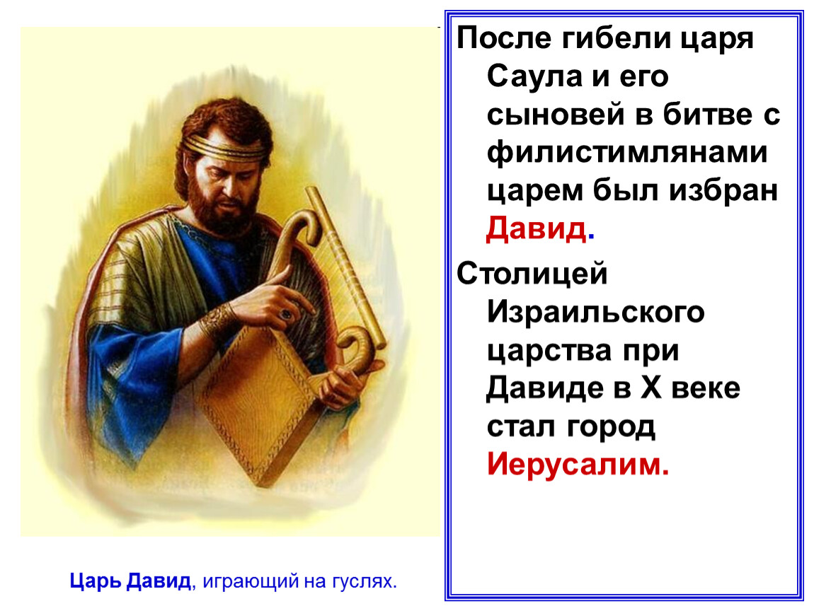 После гибели царя Саула и его сыновей в битве с филистимлянами царем был избран Давид.