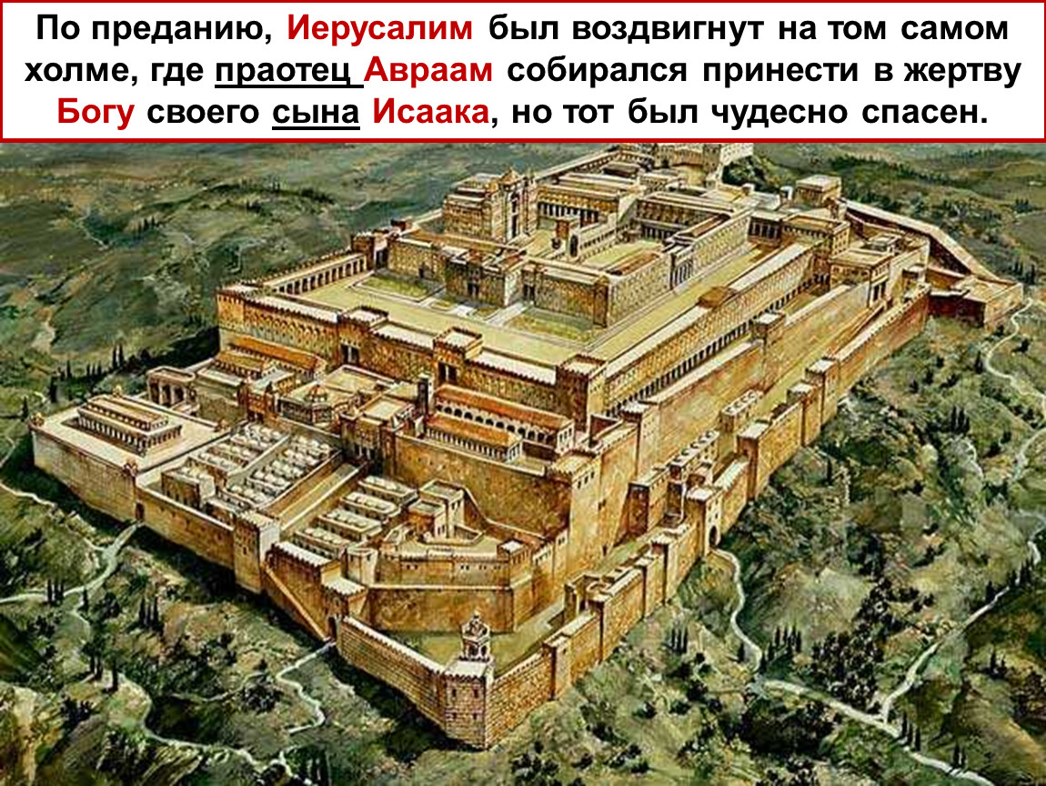 По преданию, Иерусалим был воздвигнут на том самом холме, где праотец Авраам собирался принести в жертву Богу своего сына Исаака, но тот был чудесно спасен.