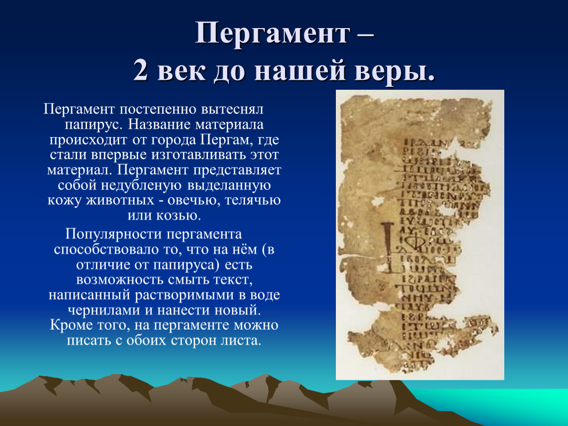 Пергамент постепенно вытеснял папирус. Название материала происходит от города Пергам, где стали впервые изготавливать этот материал. Пергамент представляет собой недубленую выделанную кожу животных - овечью, телячью или козью.