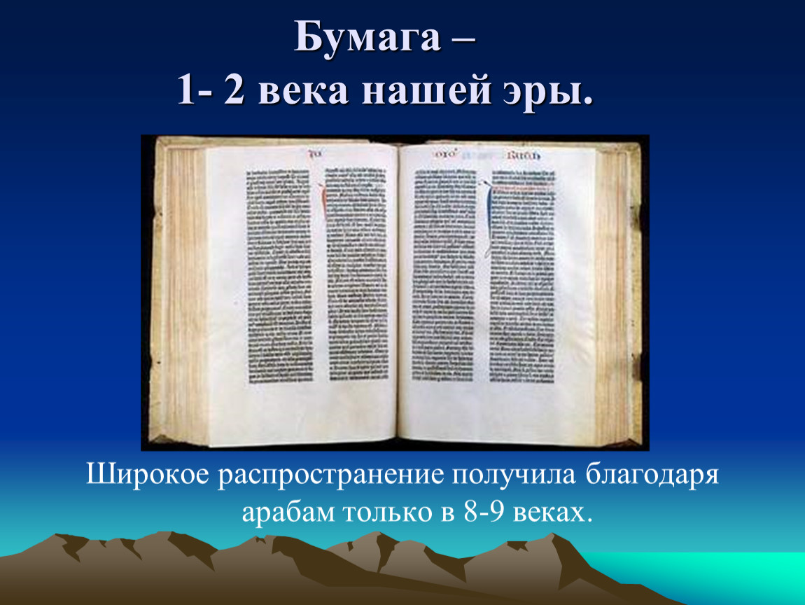 Предполагается что бумага была изобретена в Китае в конце первого или начале второго века нашей эры.