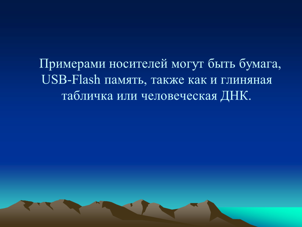 Примерами носителей могут быть бумага, USB-Flash память, также как и глиняная табличка или человеческая ДНК.