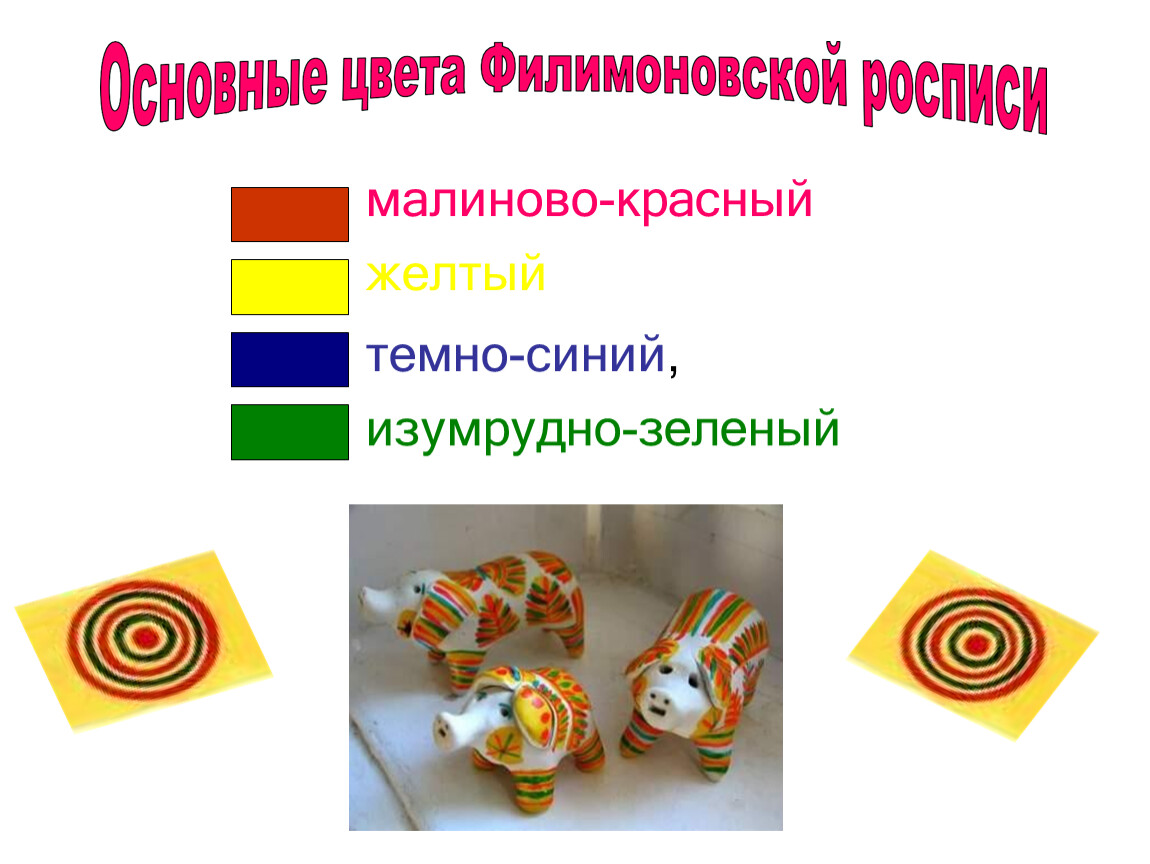 Для росписи филимоновских игрушек использовали всего три цвета — желтый, красно-малиновый и зеленый. В старину им придавали символическое значение: считалось, что желтый цвет олицетворяет воздух и солнце, красный — тепло и красоту, зеленый — весну и жизнь. Краску наносили куриным перышком в строгой очередности.