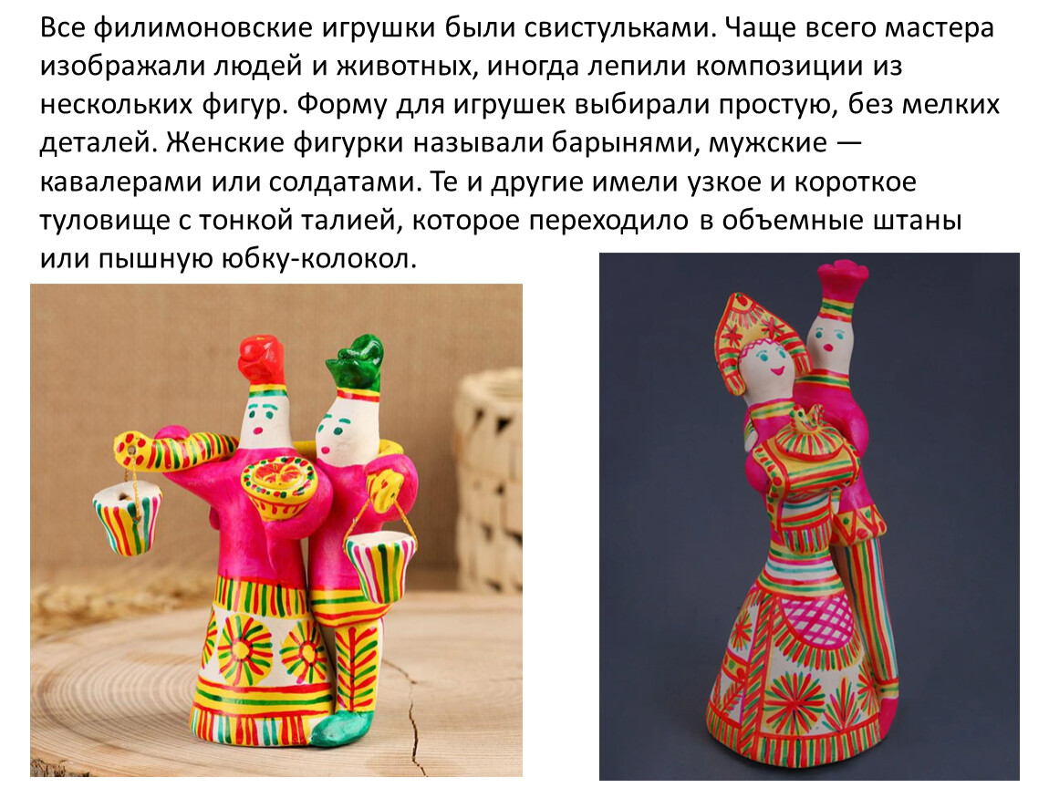 Все филимоновские игрушки были свистульками. Чаще всего мастера изображали людей и животных, иногда лепили композиции из нескольких фигур. Форму для игрушек выбирали простую, без мелких деталей. Женские фигурки называли барынями, мужские — кавалерами или солдатами. Те и другие имели узкое и короткое туловище с тонкой талией, которое переходило в объемные штаны или пышную юбку-колокол.