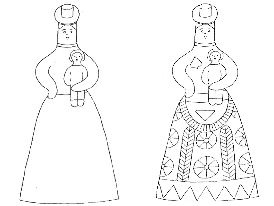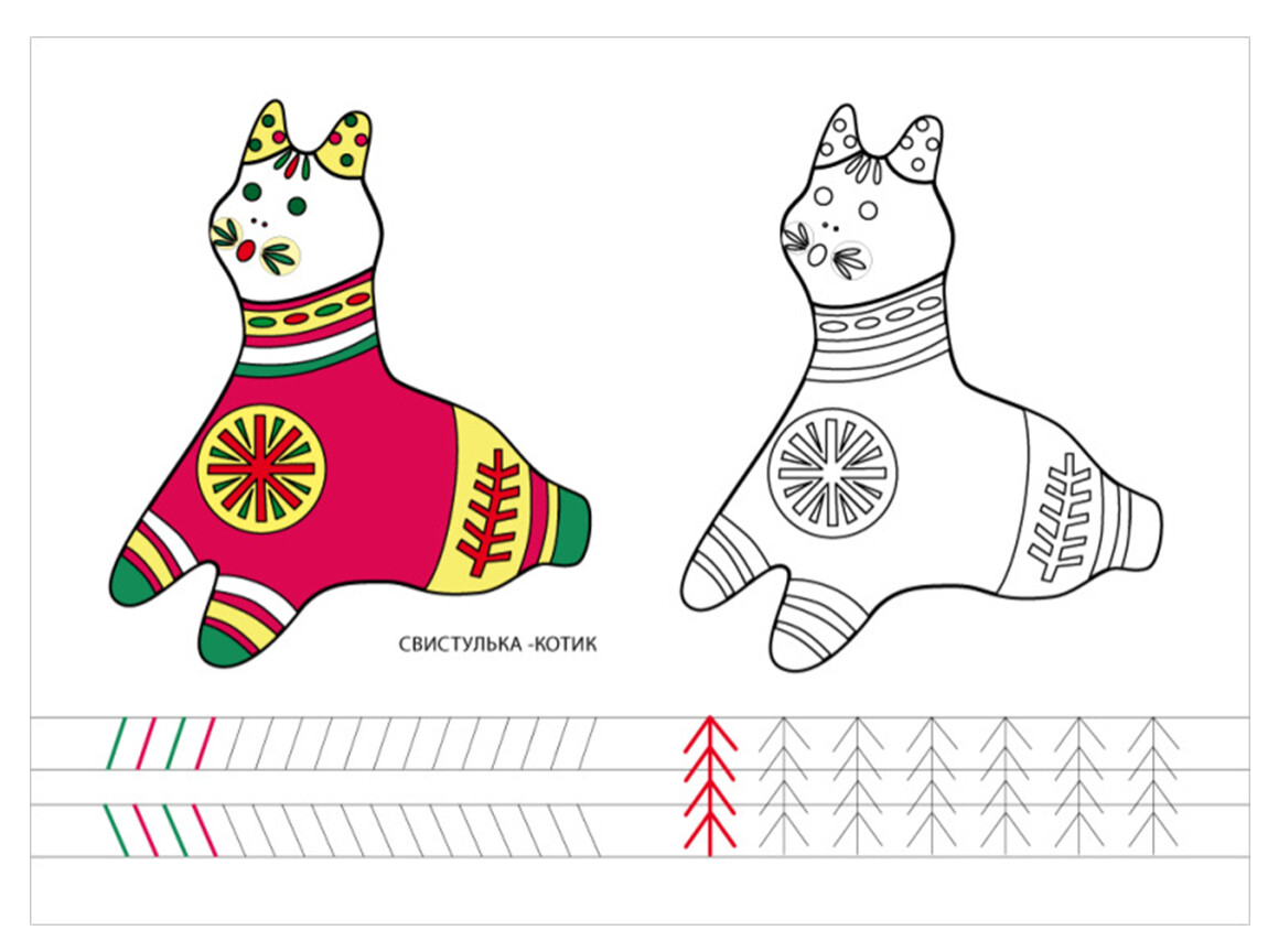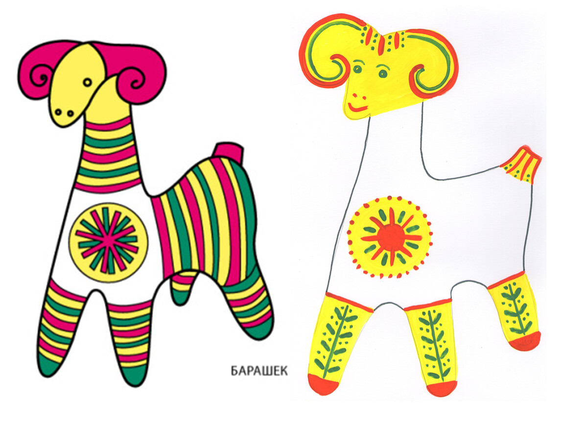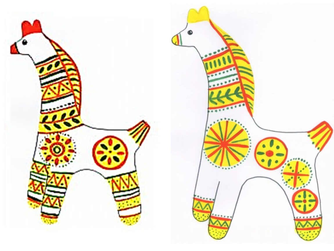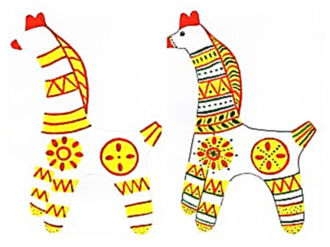 Сначала заготовку «желтили» — создавали фон из широких полос и кругов. Следующий этап - «малинка». Красной или малиновой краской, рисовали тонкие полоски, круги, точки, «елочки» и другие несложные орнаменты. Когда рисунок высыхал, между красными узорами наносили штрихи зеленого цвета: заключительный этап - «зеленкой». Лица игрушек не прорабатывали детально: только намечали красным рот, а зеленым — глаза-точки.