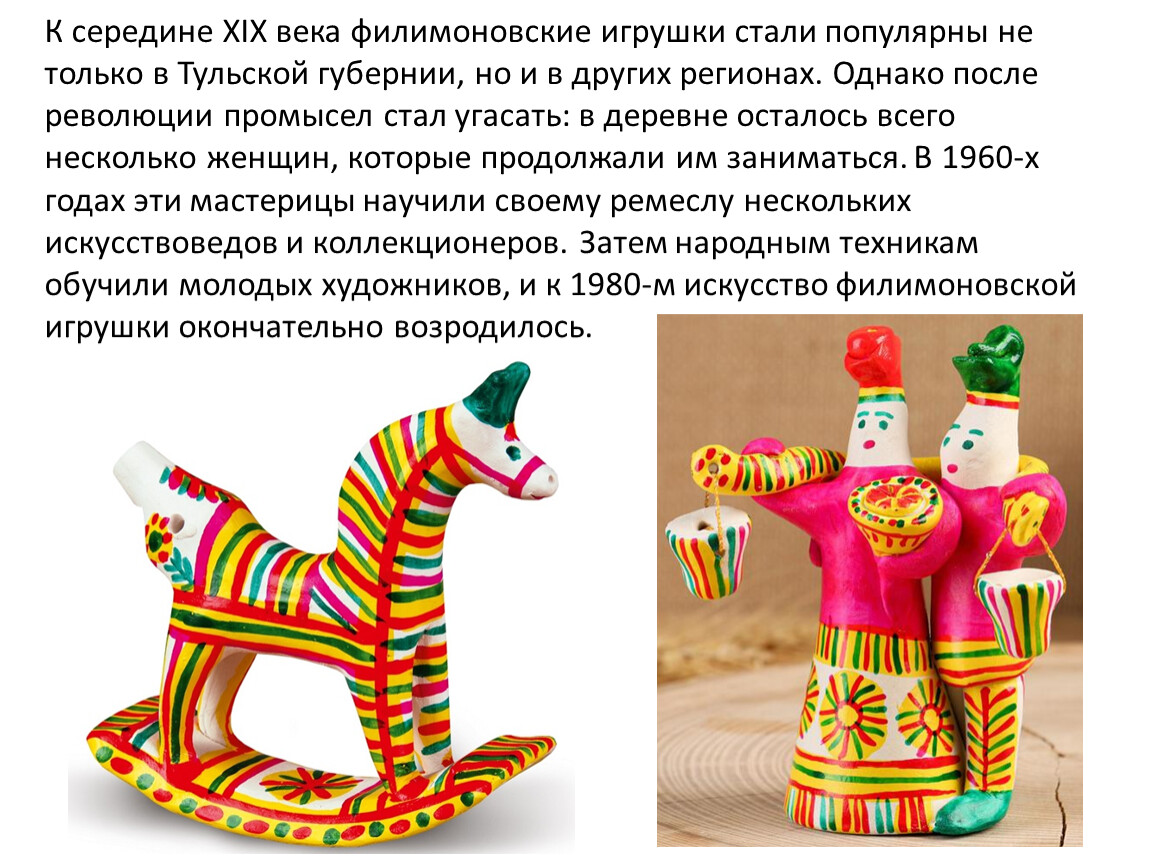 К середине XIX века филимоновские игрушки стали популярны не только в Тульской губернии, но и в других регионах. Однако после революции промысел стал угасать: в деревне осталось всего несколько женщин, которые продолжали им заниматься. В 1960-х годах эти мастерицы научили своему ремеслу нескольких искусствоведов и коллекционеров. Затем народным техникам обучили молодых художников, и к 1980-м искусство филимоновской игрушки окончательно возродилось.