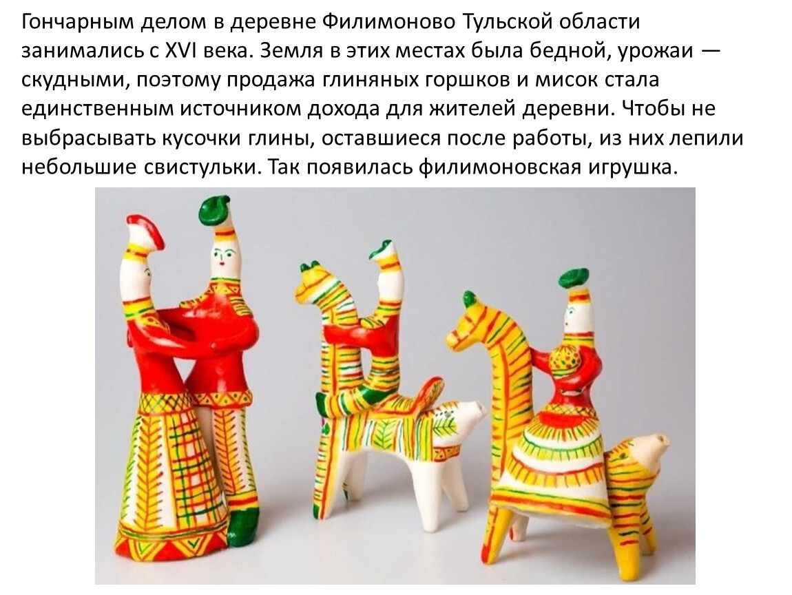 Гончарным делом в деревне Филимоново Тульской области занимались с XVI века. Земля в этих местах была бедной, урожаи — скудными, поэтому продажа глиняных горшков и мисок стала единственным источником дохода для жителей деревни. Чтобы не выбрасывать кусочки глины, оставшиеся после работы, из них лепили небольшие свистульки. Так появилась филимоновская игрушка.
