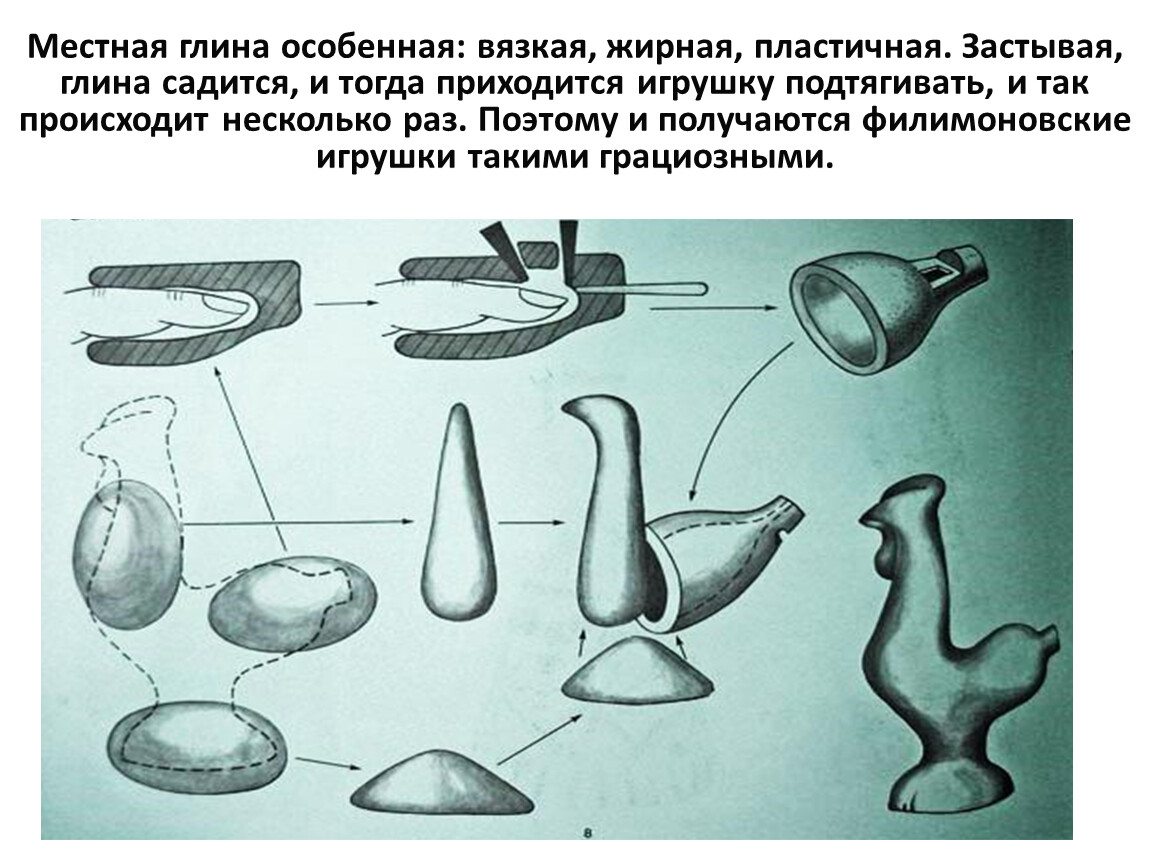 Местная глина особенная: вязкая, жирная, пластичная. Застывая, глина садится, и тогда приходится игрушку подтягивать, и так происходит несколько раз. Поэтому и получаются филимоновские игрушки такими грациозными.