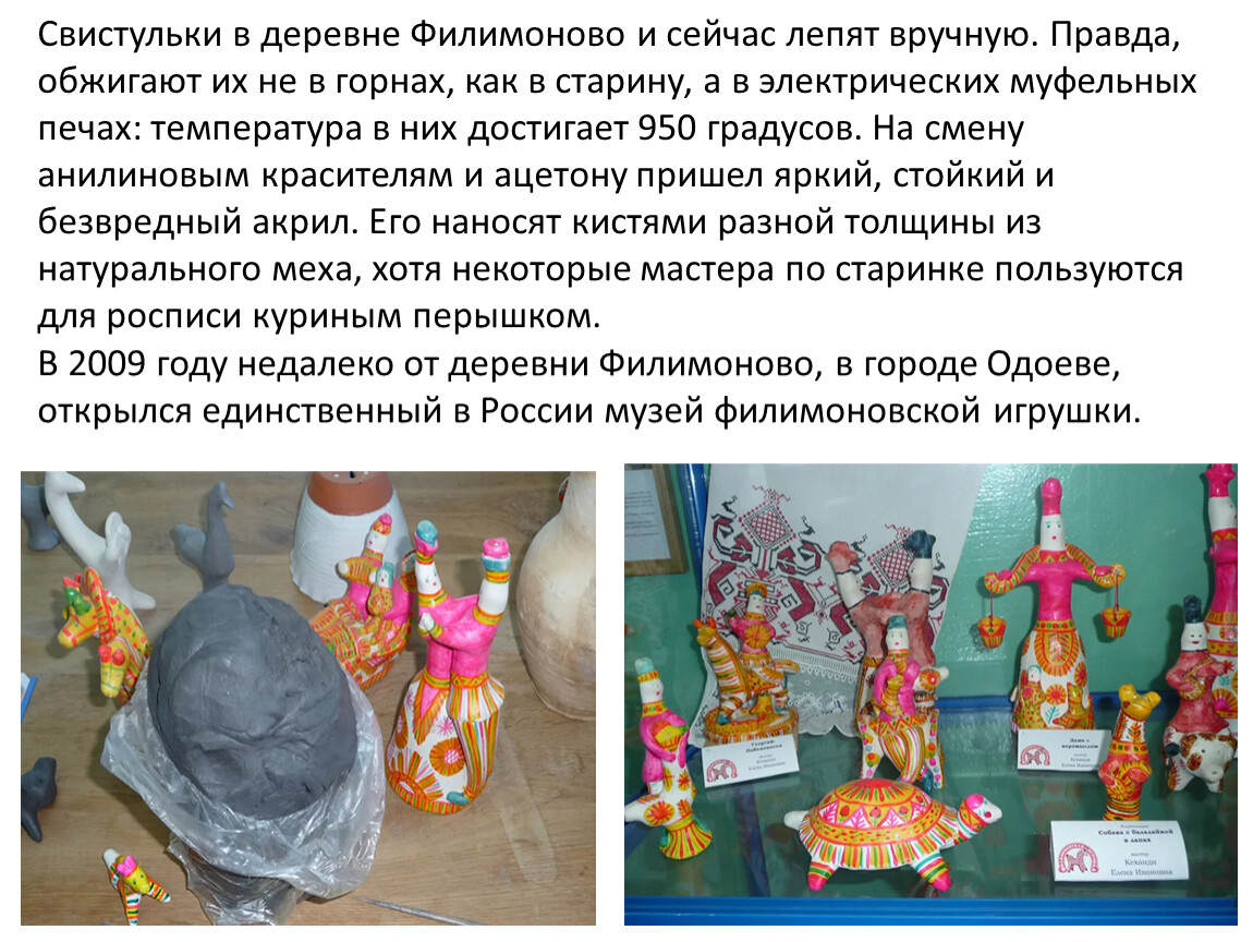 Свистульки в деревне Филимоново и сейчас лепят вручную. Правда, обжигают их не в горнах, как в старину, а в электрических муфельных печах: температура в них достигает 950 градусов. На смену анилиновым красителям и ацетону пришел яркий, стойкий и безвредный акрил. Его наносят кистями разной толщины из натурального меха, хотя некоторые мастера по старинке пользуются для росписи куриным перышком.