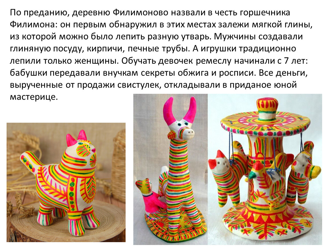 По преданию, деревню Филимоново назвали в честь горшечника Филимона: он первым обнаружил в этих местах залежи мягкой глины, из которой можно было лепить разную утварь. Мужчины создавали глиняную посуду, кирпичи, печные трубы. А игрушки традиционно лепили только женщины. Обучать девочек ремеслу начинали с 7 лет: бабушки передавали внучкам секреты обжига и росписи. Все деньги, вырученные от продажи свистулек, откладывали в приданое юной мастерице.