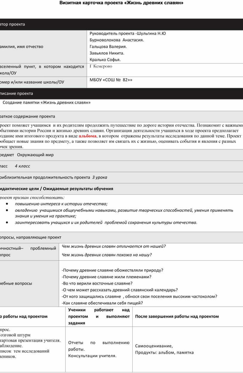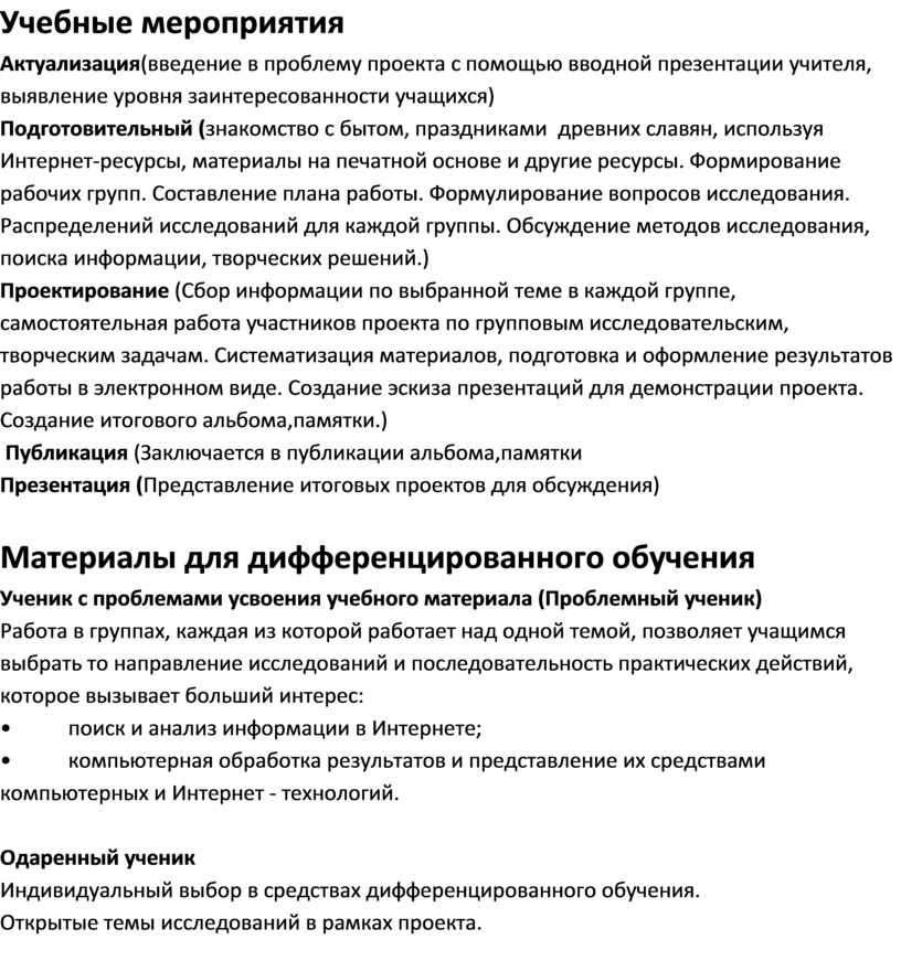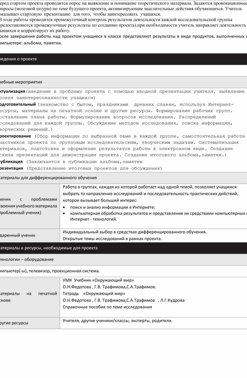 Актуализация(введение в проблему проекта с помощью вводной презентации учителя, выявление уровня заинтересованности учащихся) Подготовительный (знакомство с бытом, праздниками древних славян, используя Интернет-ресурсы, материалы на печатной основе и другие ресурсы. Формирование рабочих групп. Составление плана работы. Формулирование вопросов исследования. Распределений исследований для каждой группы. Обсуждение методов исследования, поиска информации, творческих решений.) Проектирование (Сбор информации по выбранной теме в каждой группе, самостоятельная работа участников проекта по групповым исследовательским, творческим задачам. Систематизация материалов, подготовка и оформление результатов работы в электронном виде. Создание эскиза презентаций для демонстрации проекта. Создание итогового альбома,памятки.) Публикация (Заключается в публикации альбома,памятки Презентация (Представление итоговых проектов для обсуждения) |