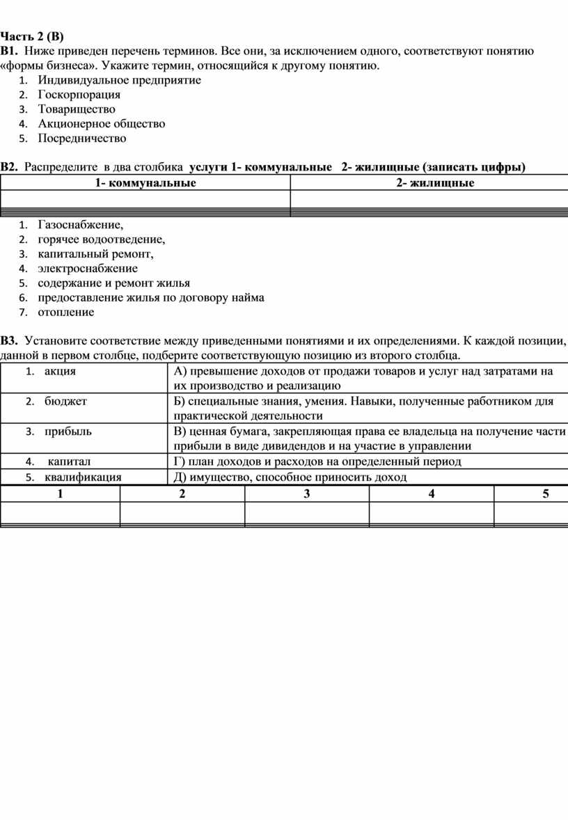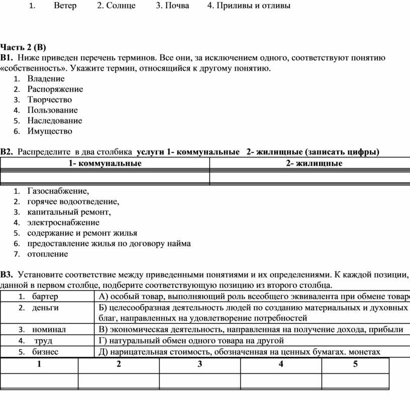В2. Распределите в два столбика услуги 1- коммунальные 2- жилищные (записать цифры)