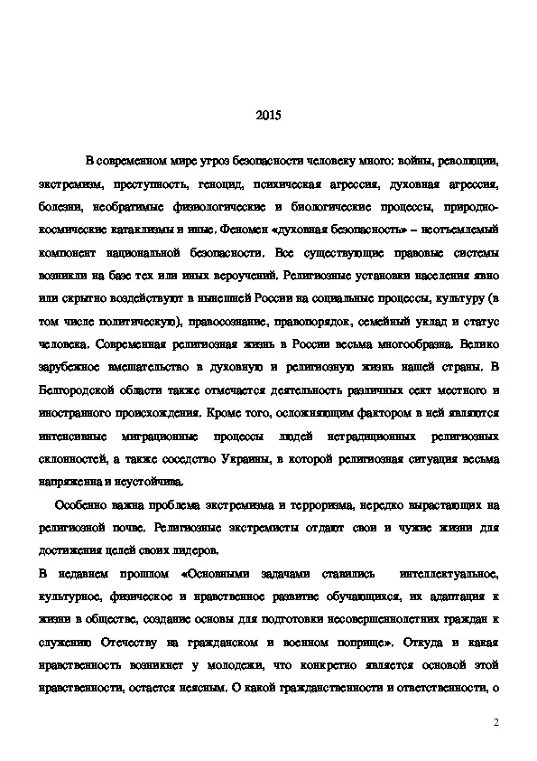 В современном мире угроз безопасности человеку много: войны, революции, экстремизм, преступность, геноцид, психическая агрессия, духовная агрессия, болезни, необратимые физиологические и биологические процессы, природно-космические катаклизмы и иные. Феномен «духовная безопасность» – неотъемлемый компонент национальной безопасности. Все существующие правовые системы возникли на базе тех или иных вероучений. Религиозные установки населения явно или скрытно воздействуют в нынешней России на социальные процессы, культуру (в том числе политическую), правосознание, правопорядок, семейный уклад и статус человека.