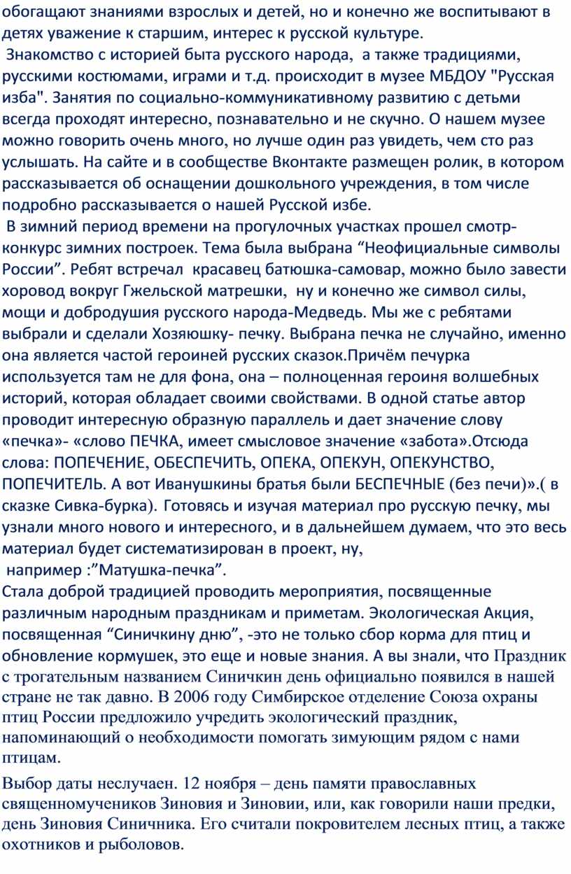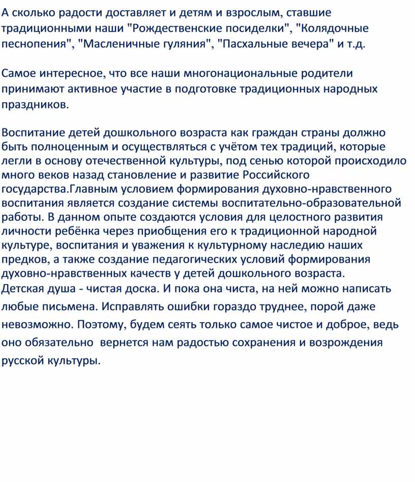 Воспитание детей дошкольного возраста как граждан страны должно быть полноценным и осуществляться с учётом тех традиций, которые легли в основу отечественной культуры, под сенью которой происходило много веков назад становление и развитие Российского государства.Главным условием формирования духовно-нравственного воспитания является создание системы воспитательно-образовательной работы. В данном опыте создаются условия для целостного развития личности ребёнка через приобщения его к традиционной народной культуре, воспитания и уважения к культурному наследию наших предков, а также создание педагогических условий формирования духовно-нравственных качеств у детей дошкольного возраста.