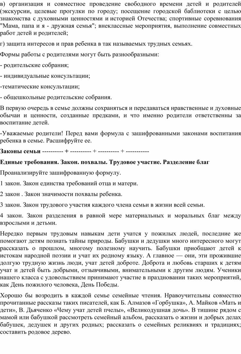 в) организация и совместное проведение свободного времени детей и родителей (экскурсии, целевые прогулки по городу; посещение городской баблиотеки с целью знакомства с духовными ценностями и историей Отечества; спортивные соревнования "Мама, папа и я - дружная семья"; внеклассные мероприятия, выполнение совместных работ детей и родителей;