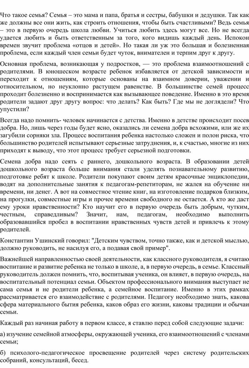 Важнейшей направленностью своей деятельности, как классного руководителя, я считаю воспитание и развитие ребенка не только в школе, а, в первую очередь, в семье. Классный руководитель должен помнить, что, воспитывая ученика, он влияет, в первую очередь, на воспитательный потенциал семьи. Объектом профессионального внимания выступает не сама семья и не родители ребенка, а семейное воспитание. Именно в этих рамках рассматривается его взаимодействие с родителями. Педагогу необходимо знать, какова сфера материального бытия ребенка, каков образ его жизни, каковы традиции и обычаи семьи.
