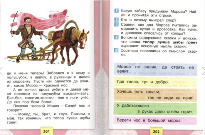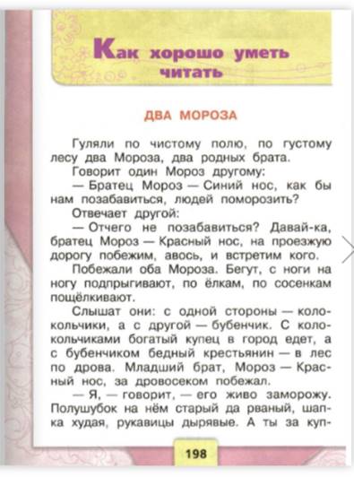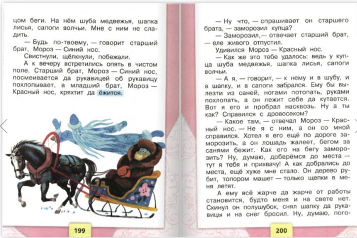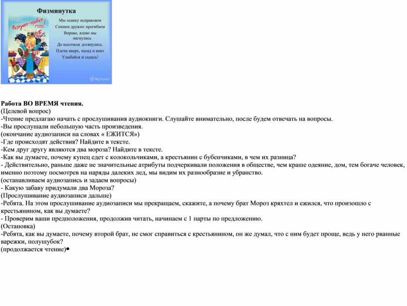 Работа ВО ВРЕМЯ чтения. (Целевой вопрос) -Чтение предлагаю начать с прослушивания аудиокниги. Слушайте внимательно, после будем отвечать на вопросы. -Вы прослушали небольшую часть произведения. (окончание аудиозаписи на словах « ЕЖИТСЯ») -Где происходят действия? Найдите в тексте. -Кем друг другу являются два мороза? Найдите в тексте. -Как вы думаете, почему купец едет с колокольчиками, а крестьянин с бубенчиками, в чем их разница? - Действительно, раньше даже не значительные атрибуты подчеркивали положения в обществе, чем краше одеяние, дом, тем богаче человек, именно поэтому посмотрев на наряды далеких лед, мы видим их разнообразие и убранство. (останавливаем аудиозапись и задаем вопросы) - Какую забаву придумали два Мороза? (Прослушивание аудиозаписи дальше) -Ребята. На этом прослушивание аудиозаписи мы прекращаем, скажите, а почему брат Мороз кряхтел и ежился, что произошло с крестьянином, как вы думаете? - Проверим ваши предположения, продолжив читать, начинаем с 1 парты по предложению. (Остановка) -Ребята, как вы думаете, почему второй брат, не смог справиться с крестьянином, он же думал, что с ним будет проще, ведь у него рванные варежки, полушубок? (продолжается чтение) |