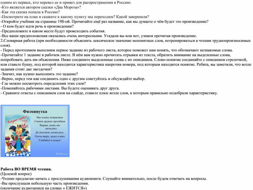 Работа ДО чтения. 1.Прогнозирование содержание произведения по заголовкам, иллюстрации, героям, фамилии автора, ключевым словам и т.д. -Мы с вами составили план знакомства с произведением, что мы сделаем сначала? - Слушайте внимательно мой рассказ, я буду задавать вопросы. - В далекие времена, когда люди еще не умели читать и писать и у них не было книг, телевизоров и интернета, они очень много общались между собой: пересказывали услышанные от других истории, придумывали свои, чтобы развлечь друг друга, делились новостями, шутили, фантазировали. Самые интересные сказки (складки) оставались в памяти многих на долгие времена и устно пересказывались, распространяясь в пространстве и времени. Неизвестно, кто первым рассказал ту или иную историю, чья фантазия породила удивительный шедевр. Одним из таких шедевров является русская народная сказка «Два Мороз». Если вы возьмете книгу в библиотеке «Два Мороза», то увидите на ней автора Михаил Ларионович Михайлова, но на самом деле он не является автором. Путешествуя за границей, М. Л. услышал эту сказку среди местного населения и был одним из первых, кто перевел ее и привез для распространения в Россию. -Кто является автором сказки «Два Мороза»? -Как эта сказка попала в Россию? -Посмотрите на план и скажите к какому пункту мы переходим? Какой завершили? -Откройте учебник на странице 198-ой. Прочитайте ещё раз название, как вы думаете о чём будет это произведение? - О ком будет идти речь в произведении? -Предположите в каком месте будут происходить события. -Все ваши предположения оказались очень интересными. Угадали вы или нет, узнаем прочитав произведение. 2.Словарная работа (при необходимости объяснить лексическое значение непонятных слов, потренироваться в чтении труднопроизносимых слов). - Перед прочтением выполним первое задание из рабочего листа, которое поможет нам понять, что обозначают незнакомые слова. -Прочитайте 1 задание в рабочем листе. В нём вам нужно прочитать отрывки из текста, обратить внимание на выделенные слова, попробовать дать им объяснения. Ниже соедините выделенные слова с их описанием. Слово-понятие соединяйте с описанием стрелочкой, или ставьте букву, под которой находится характеристика напротив номера, под которым находится понятие. Ребята, вы заметили, что возле задания стоят две звездочки? -Значит, как нужно выполнять это задание? -Верно, перед тем как соединить одно с другим советуйтесь и обсуждайте выбор. -Где можно посмотреть определения этих слов? -Поменяйтесь рабочими листами. Вы будете оценивать друг друга. - Сравните ответы с описанием слов на слайде, ставьте плюс возле слов, к которым правильно подобрали характеристику.