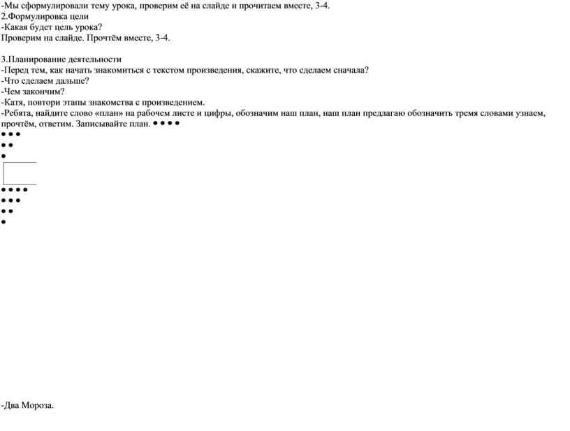 3.Планирование деятельности -Перед тем, как начать знакомиться с текстом произведения, скажите, что сделаем сначала? -Что сделаем дальше? -Чем закончим? -Катя, повтори этапы знакомства с произведением. -Ребята, найдите слово «план» на рабочем листе и цифры, обозначим наш план, наш план предлагаю обозначить тремя словами узнаем, прочтём, ответим. Записывайте план. |