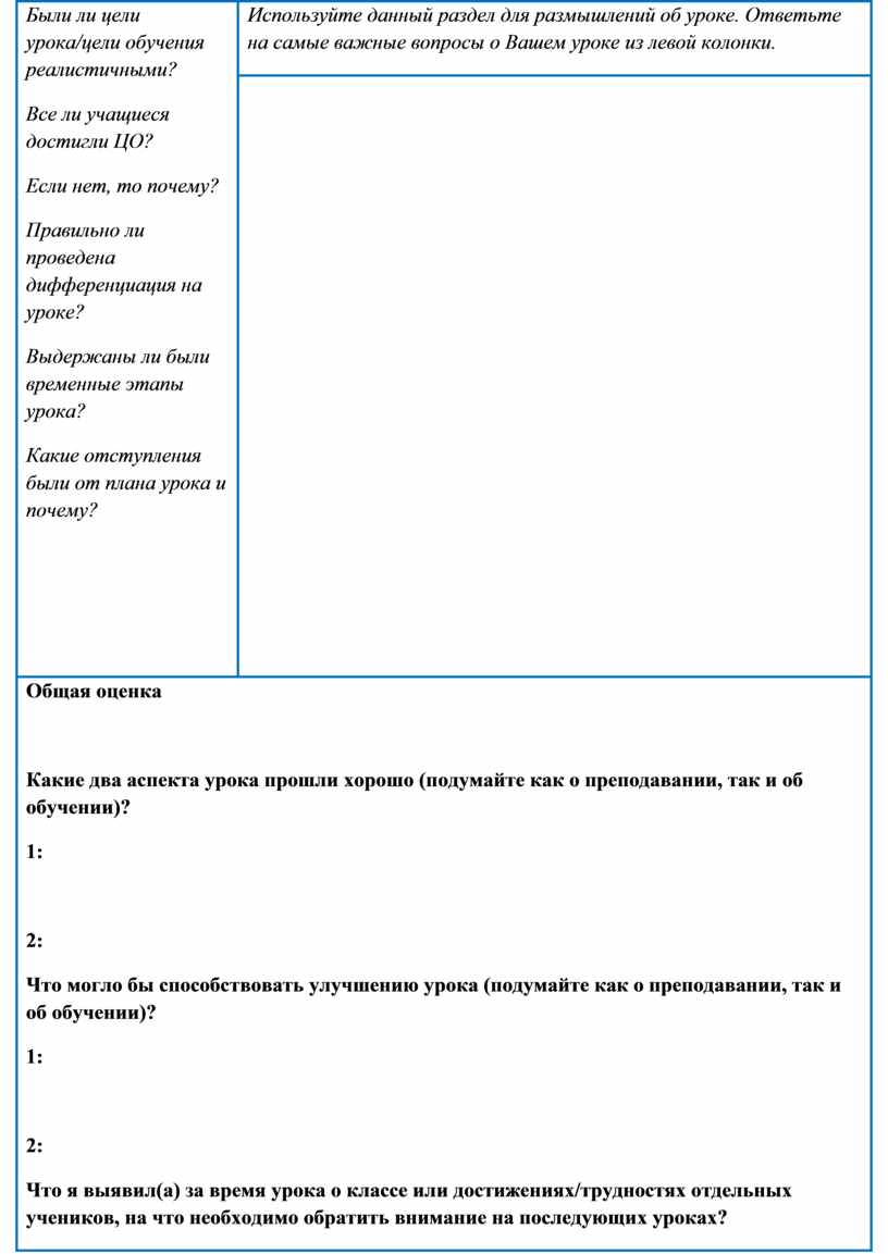 Используйте данный раздел для размышлений об уроке. Ответьте на самые важные вопросы о Вашем уроке из левой колонки. |