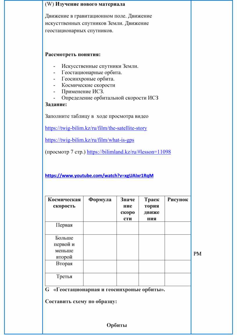 Рассмотреть понятия: - Искусственные спутники Земли. - Геостационарные орбита. - Геосинхроные орбита. - Космические скорости - Применение ИСЗ. - Определение орбитальной скорости ИСЗ Задание: Заполните таблицу в ходе просмотра видео https://twig-bilim.kz/ru/film/the-satellite-story https://twig-bilim.kz/ru/film/what-is-gps (просмотр 7 стр.) https://bilimland.kz/ru/#lesson=11098