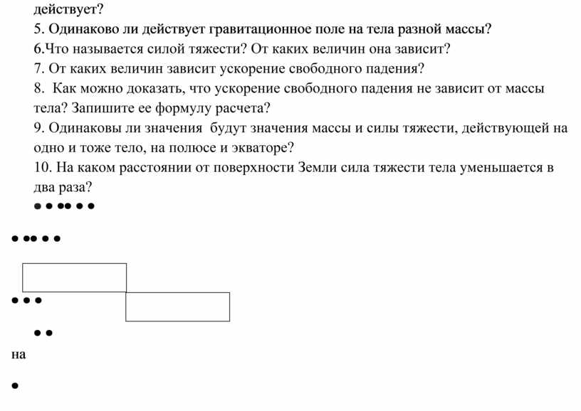Организационный момент Целеполагание (W)Экспресс опрос 1. Что такое гравитационное поле? 2.Сформулируйте закон всемирного тяготения и запишите ее формулу 3. Физический смысл гравитационной постоянной? Ее численное значение? Ее единицы измерения? 4. На каком расстоянии гравитационное поле сильнее действует? 5. Одинаково ли действует гравитационное поле на тела разной массы? 6.Что называется силой тяжести? От каких величин она зависит? 7. От каких величин зависит ускорение свободного падения? 8. Как можно доказать, что ускорение свободного падения не зависит от массы тела? Запишите ее формулу расчета? 9. Одинаковы ли значения будут значения массы и силы тяжести, действующей на одно и тоже тело, на полюсе и экваторе? 10. На каком расстоянии от поверхности Земли сила тяжести тела уменьшается в два раза?