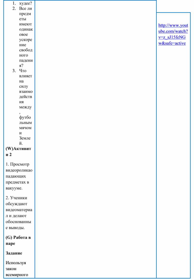 Организационный момент. Целеполагание (W)Активити 1 Мозговой штурм (T) Учитель может задать вопросы, такие как: 1. Почему предметы падают? 2. Если в космосе нет воздуха, есть ли там гравитация? 3. Какая разница между весом и массойтела? 4. Почему на Луне вы весите меньше? 5. Если на Луне вы весите меньше, будете ли вы там худее? 6. Все ли предметы имеют одинаковое ускорение свободного падения? 7. Что влияет на силу взаимодействия между, футбольным мячом и Землей. (W)Активити 2 1. Просмотр видеороликао падающих предметах в вакууме. 2. Ученики обсуждают видеоматериал и делают обоснованные выводы. (G) Работа в паре Задание Используя закон всемирного тяготения и формулу для определения силы тяжести. Выведите формулу для определения напряженности гравитационного поля (ускорения свободного падения).