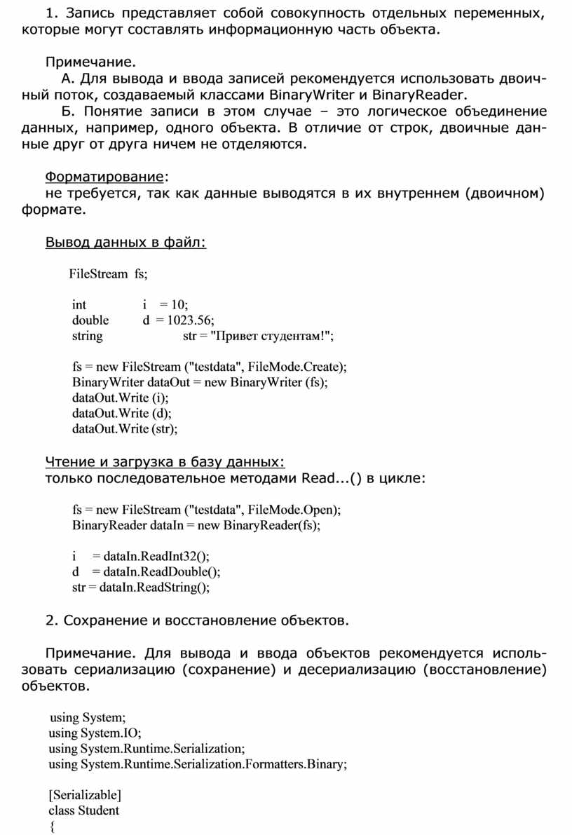А. Для вывода и ввода записей рекомендуется использовать двоич- ный поток, создаваемый классами BinaryWriter и BinaryReader.