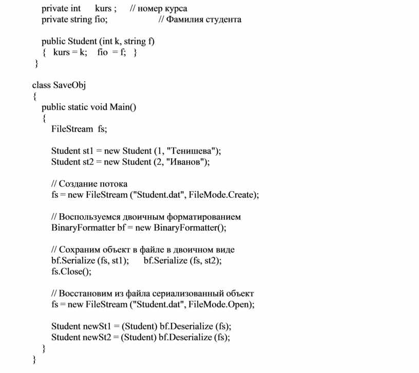 // Сохраним объект в файле в двоичном виде bf.Serialize (fs, st1); bf.Serialize (fs, st2); fs.Close();