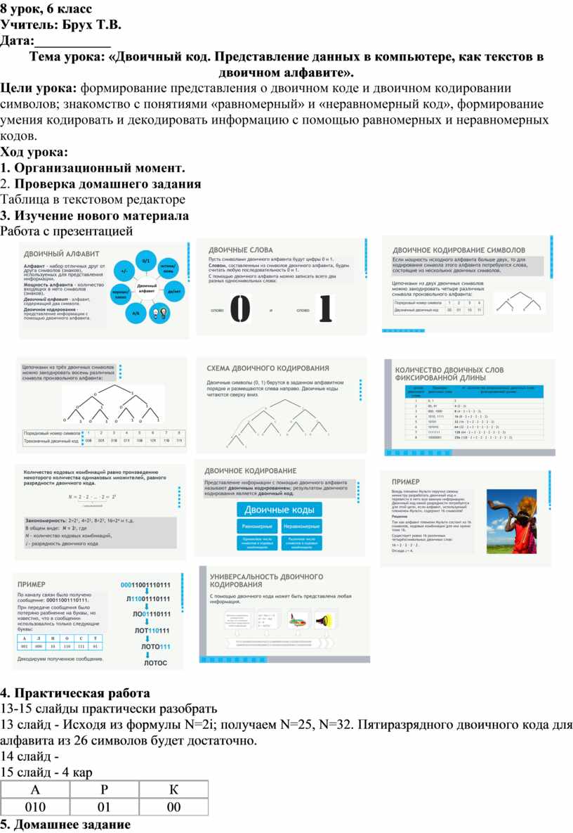 Тема урока: «Двоичный код. Представление данных в компьютере, как текстов в двоичном алфавите».