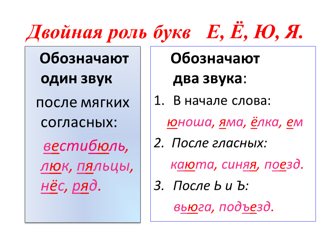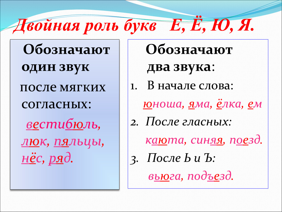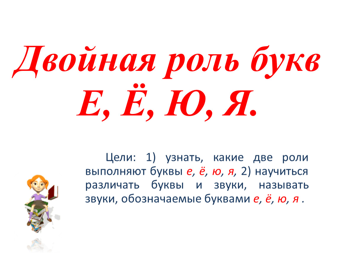 Цели: 1) узнать, какие две роли выполняют буквы е, ё, ю, я, 2) научиться различать буквы и звуки, называть звуки, обозначаемые буквами е, ё, ю, я .