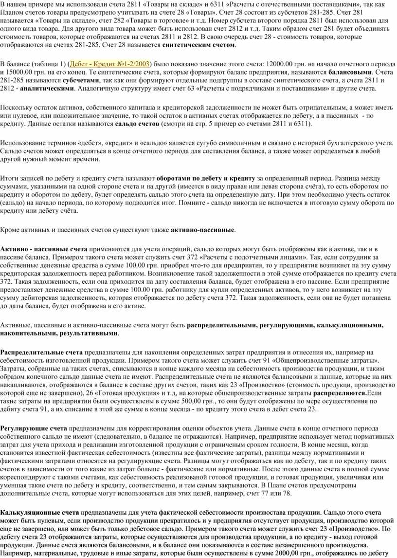 В балансе (таблица 1) (Дебет - Кредит №1-2/2003) было показано значение этого счета: 12000.00 грн. на начало отчетного периода и 15000.00 грн. на его конец. Те синтетические счета, которые формируют баланс предприятия, называются балансовыми. Счета 281-285 называются субсчетами, так как они формируют отдельные подгруппы в составе синтетического счета, а счета 2811 и 2812 - аналитическими. Аналогичную структуру имеет счет 63 «Расчеты с подрядчиками и поставщиками» и другие счета.