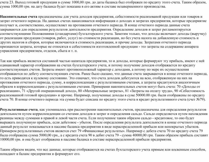 Калькуляционные счета предназначены для учета фактической себестоимости произвостава продукции. Сальдо этого счета может быть нулевым, если производство продукции прекратилось и у предприятия отсутствует продукция, производство которой еще не завершено, или может быть только дебетовое сальдо. Примером такого счета может служить счет 23 «Производство». По дебету счета 23 отображаются затраты, которые осуществляются для производства продукции, а по кредиту - выход готовой продукции. Данные счета являются балансовыми, и в балансе они показываются в составе незавершенного производства. Например, материальные, трудовые и иные затраты, которые были осуществлены в сумме 2000,00 грн., отображались по дебету счета 23. Выход готовой продукции в сумме 1000,00 грн. до даты баланса был отображен по кредиту этого счета. Таким образом, сумма 1000,00 грн. на дату баланса будет показана в его активе в составе незавершенного производства.