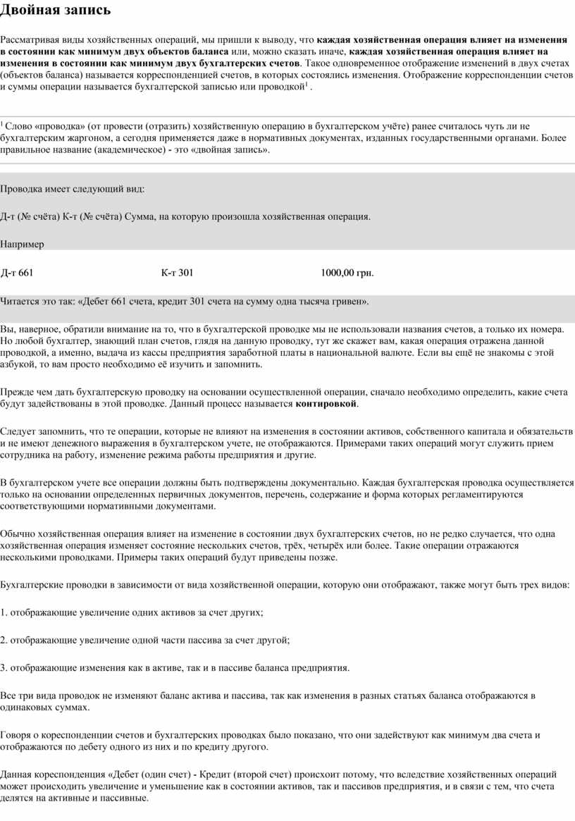 1 Слово «проводка» (от провести (отразить) хозяйственную операцию в бухгалтерском учёте) ранее считалось чуть ли не бухгалтерским жаргоном, а сегодня применяется даже в нормативных документах, изданных государственными органами. Более правильное название (академическое) - это «двойная запись».