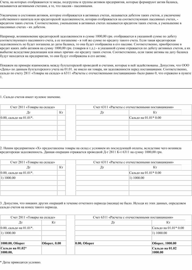 Например, возникновение кредиторской задолженности в сумме 1000,00 грн. отображается в указанной сумме по дебету соответствующего пассивного счета, а ее погашение - в той же сумме по кредиту такого счета. Если такая кредиторская задолженность не будет погашена до даты баланса, то она будет отображена в его пассиве. Соответственно, приобретение в кредит каких либо активов на сумму 1000,00 грн. (товаров и т.д.) - в указанной сумме отражается по дебету активных счетов, а их выбытие вследствие реализации или иных причин -по кредиту таких счетов. Соответственно, если такие активы на дату баланса будут находится на предприятии, то они будут отображены в его активе.