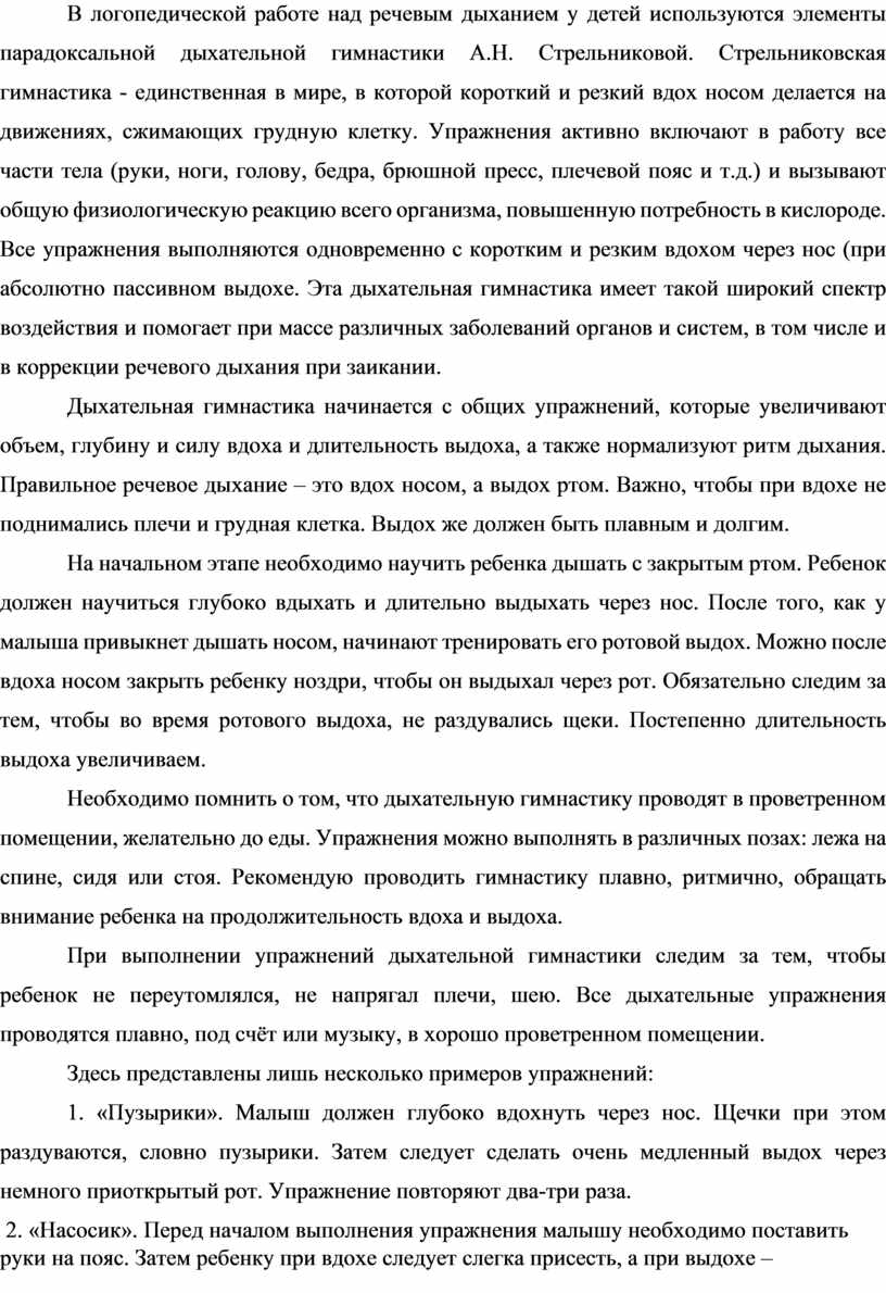 В логопедической работе над речевым дыханием у детей используются элементы парадоксальной дыхательной гимнастики А.Н. Стрельниковой. Стрельниковская гимнастика - единственная в мире, в которой короткий и резкий вдох носом делается на движениях, сжимающих грудную клетку. Упражнения активно включают в работу все части тела (руки, ноги, голову, бедра, брюшной пресс, плечевой пояс и т.д.) и вызывают общую физиологическую реакцию всего организма, повышенную потребность в кислороде. Все упражнения выполняются одновременно с коротким и резким вдохом через нос (при абсолютно пассивном выдохе. Эта дыхательная гимнастика имеет такой широкий спектр воздействия и помогает при массе различных заболеваний органов и систем, в том числе и в коррекции речевого дыхания при заикании.