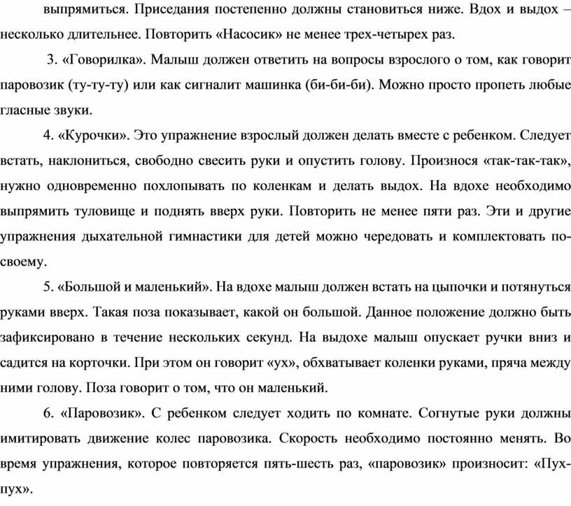 2. «Насосик». Перед началом выполнения упражнения малышу необходимо поставить руки на пояс. Затем ребенку при вдохе следует слегка присесть, а при выдохе – выпрямиться. Приседания постепенно должны становиться ниже. Вдох и выдох – несколько длительнее. Повторить «Насосик» не менее трех-четырех раз.