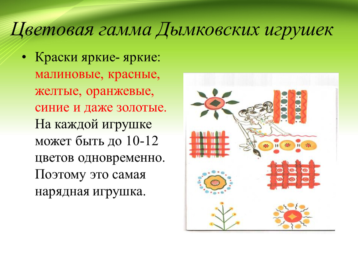 Краски яркие- яркие: малиновые, красные, желтые, оранжевые, синие и даже золотые. На каждой игрушке может быть до 10-12 цветов одновременно. Поэтому это самая нарядная игрушка.