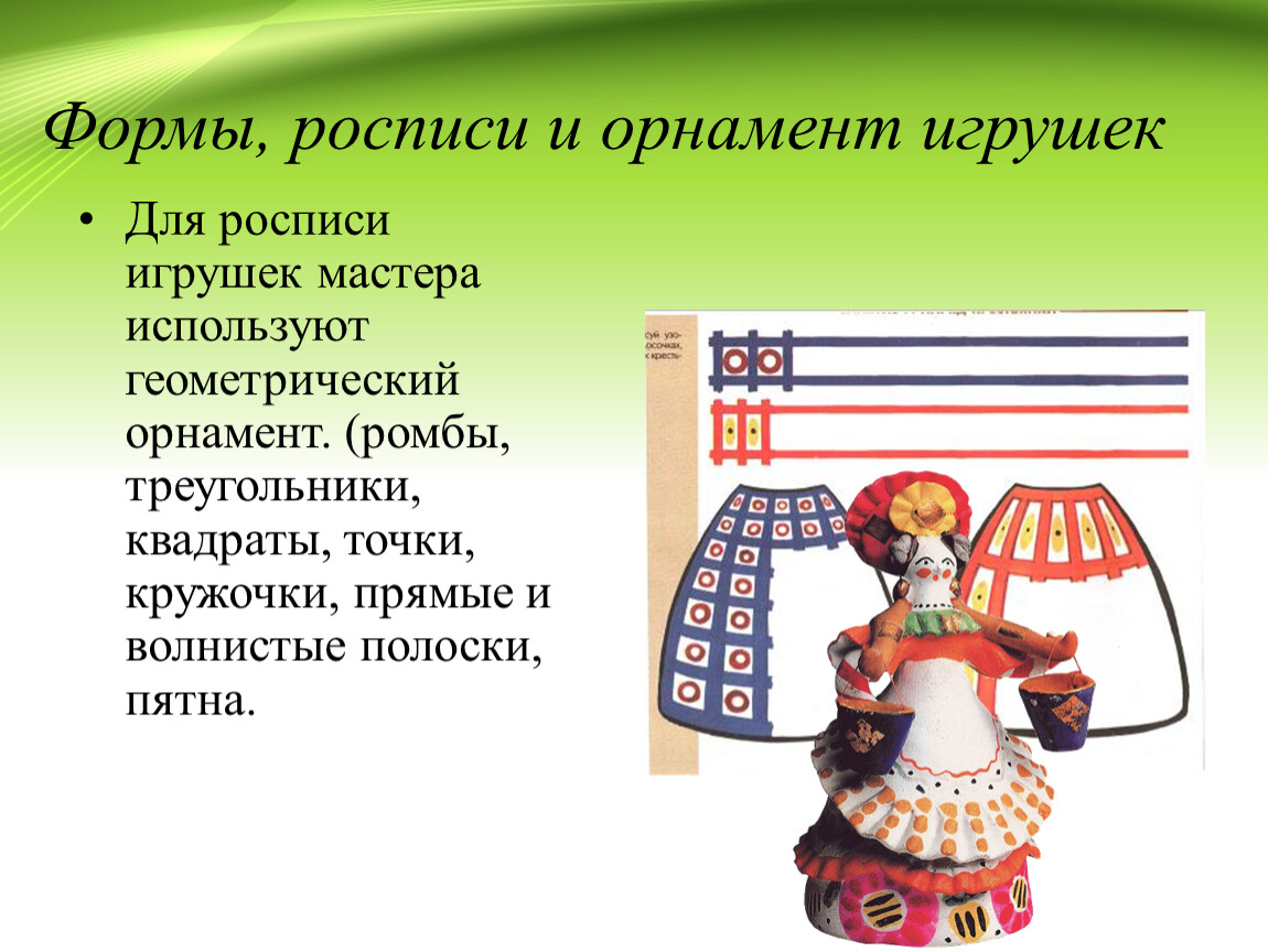 Для росписи игрушек мастера используют геометрический орнамент. (ромбы, треугольники, квадраты, точки, кружочки, прямые и волнистые полоски, пятна.