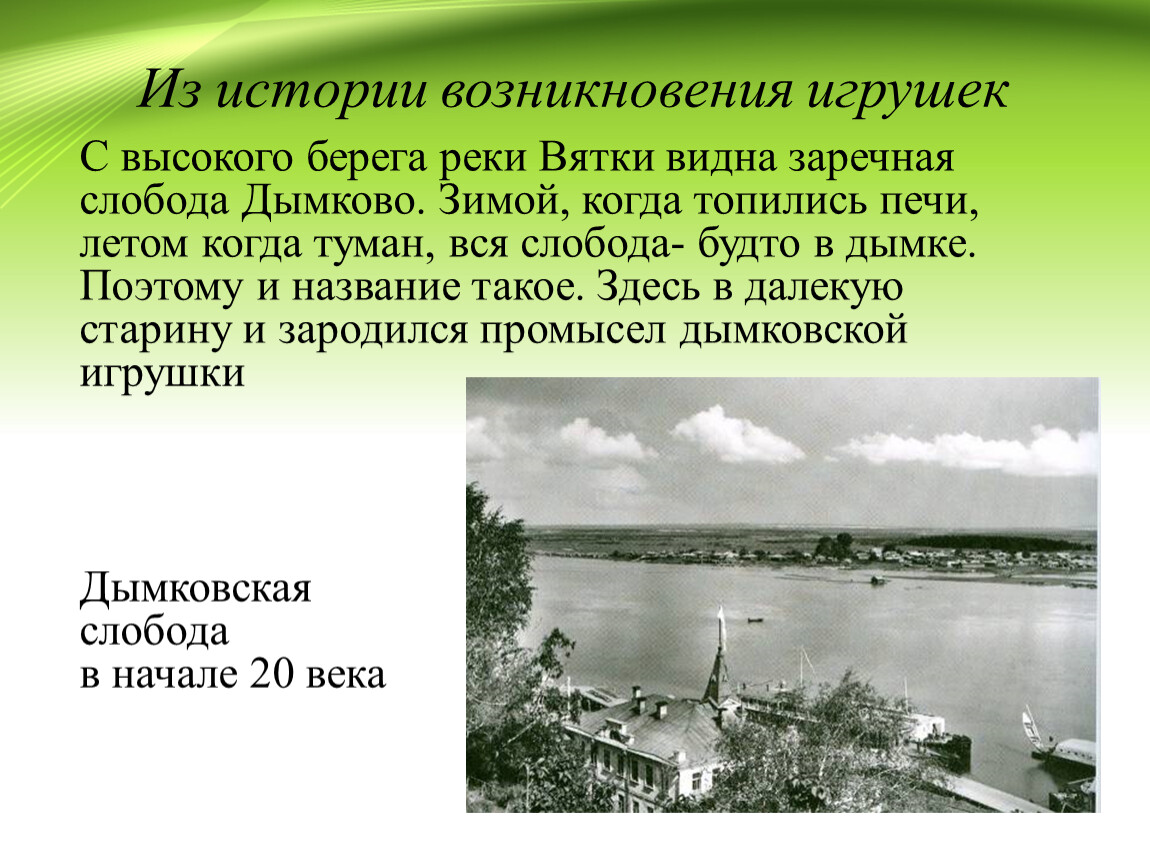С высокого берега реки Вятки видна заречная слобода Дымково. Зимой, когда топились печи, летом когда туман, вся слобода- будто в дымке. Поэтому и название такое. Здесь в далекую старину и зародился промысел дымковской игрушки