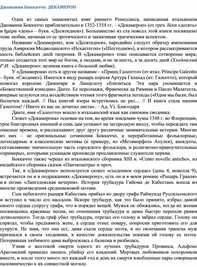 Так, в «Декамероне» используется сюжет «съеденное сердце» (день 4, новелла 9), встречается он и в подражаниях «Декамерону», есть он и в моем романе «Рыцарь Грааля» и в поэме «Лангедокская вечерня». История трубадура Гийома де Кабестань вошла во многие произведения средневековой поэзии.