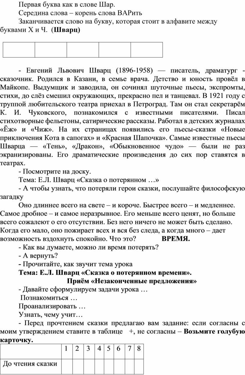 - А чтобы узнать правильно вы ответили или нет, нужно прочитать сказку Е. Л. Шварца. В конце урока мы вернёмся к этой таблице, отложите листочек на угол стола.