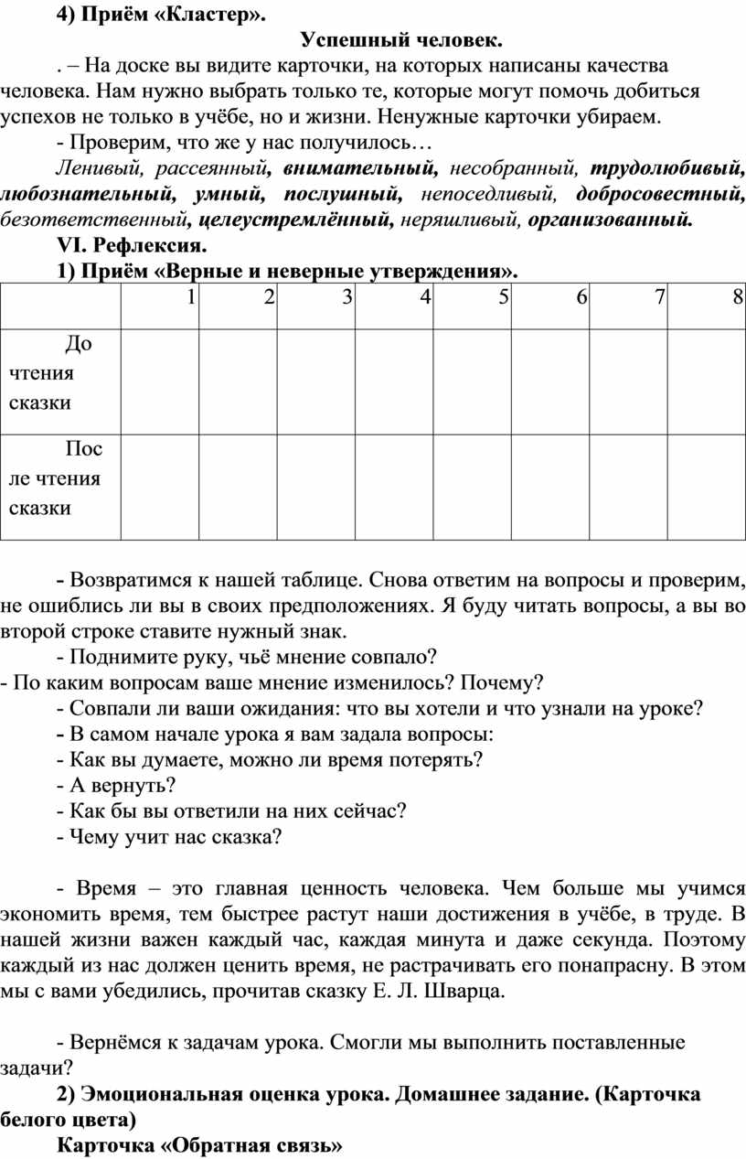 . – На доске вы видите карточки, на которых написаны качества человека. Нам нужно выбрать только те, которые могут помочь добиться успехов не только в учёбе, но и жизни. Ненужные карточки убираем.