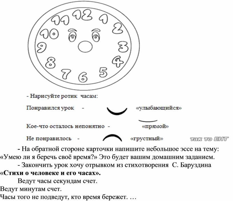 - На обратной стороне карточки напишите небольшое эссе на тему: «Умею ли я беречь своё время?» Это будет вашим домашним заданием.
