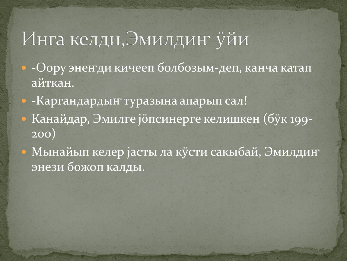 Эртечиге,Эмилдиҥ энезине кере тӱжине ээн турада отурарга кунукчылду,калганчы ӧйлӧрдӧ эмеген там ла јаҥысканзынып,јӱрди. Ойто јурт јаар кӧчӱп јадайын дезе,јаҥыс уулын јаман айткадый…