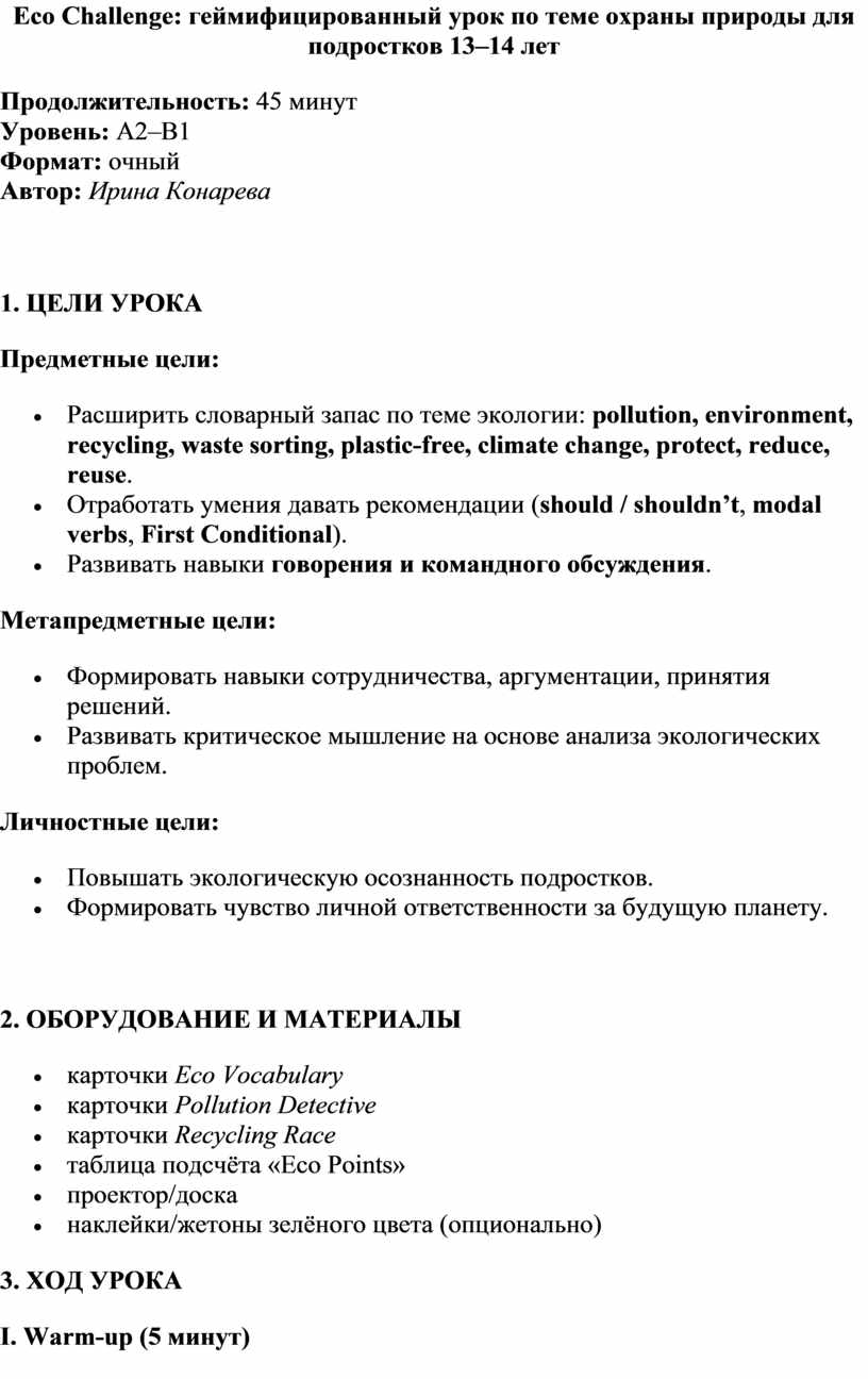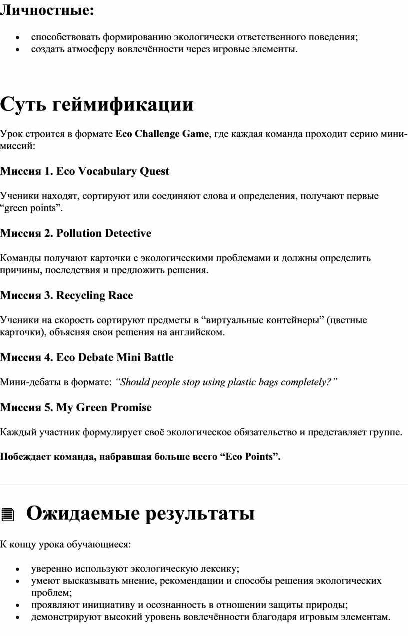 Урок строится в формате Eco Challenge Game, где каждая команда проходит серию мини-миссий: