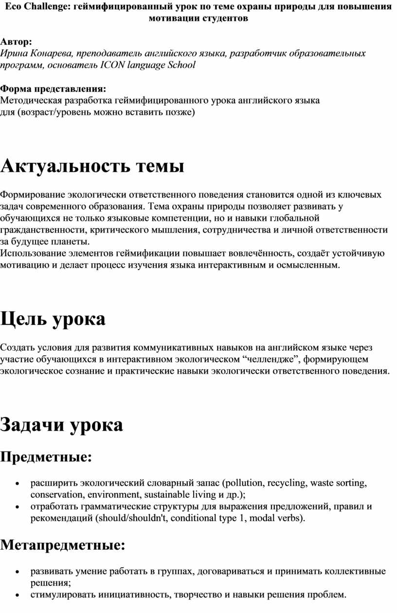Eco Challenge: геймифицированный урок по теме охраны природы для повышения мотивации студентов