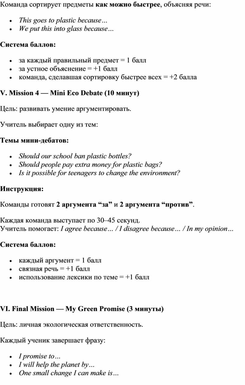 V. Mission 4 — Mini Eco Debate (10 минут)