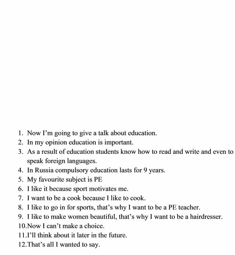 You are going to give a talk about education. You will have to start in 1,5 minutes and speak for not more than 2 minutes (10-12 sentences). Remember to say:
